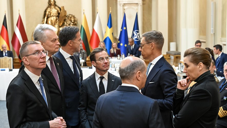 epa11823704 (L-R) President of Latvia Edgars Rinkevics, President of Lithuania Gitanas Nauseda, NATO Secretary General Mark Rutte, Prime Minister of Sweden Ulf Kristersson, President of the Republic of Finland Alexander Stubb, Prime Minister of Denmark Mette Frederiksen and German Chancellor Olaf Scholz (front) attend the Baltic Sea NATO Allies Summit in Helsinki, Finland, 14 January 2025. EPA/KIMMO BRANDT (MaxPPP TagID: epaliveseven985642.jpg) [Photo via MaxPPP]